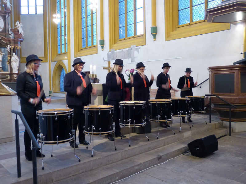 Nach einer kurzen Pause begeisterten sechs Frauen der „New Voices“ mit einer Trommeleinlage. Im Sommer hatte für die New Voices ein Trommelworkshop stattgefunden und viele waren so begeistert, dass sie an weiteren Übungstagen für das Konzert eine kleine Aufführung Percussion einübten. Das Ergebnis war ausdrucksstark und man kann augenzwinkernd behaupten, die Blue-Man-Group hat ihren weiblichen Gegenpart gefunden!